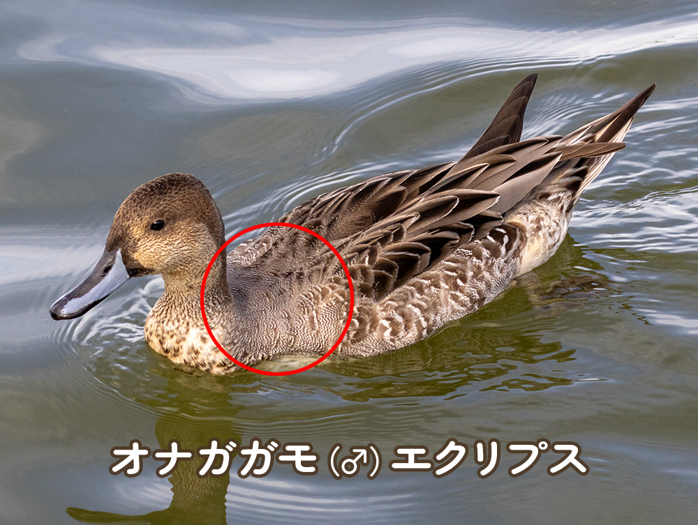換羽の進行具合によって、これはオスだな、とすぐに分かる個体もいるのですが、なかなか分からないオスも多いです。この個体は背中と脇腹に生殖羽が出てきているのでオスと分かります。胸の斑はまばらですので成鳥、これぞエクリプスでしょう!