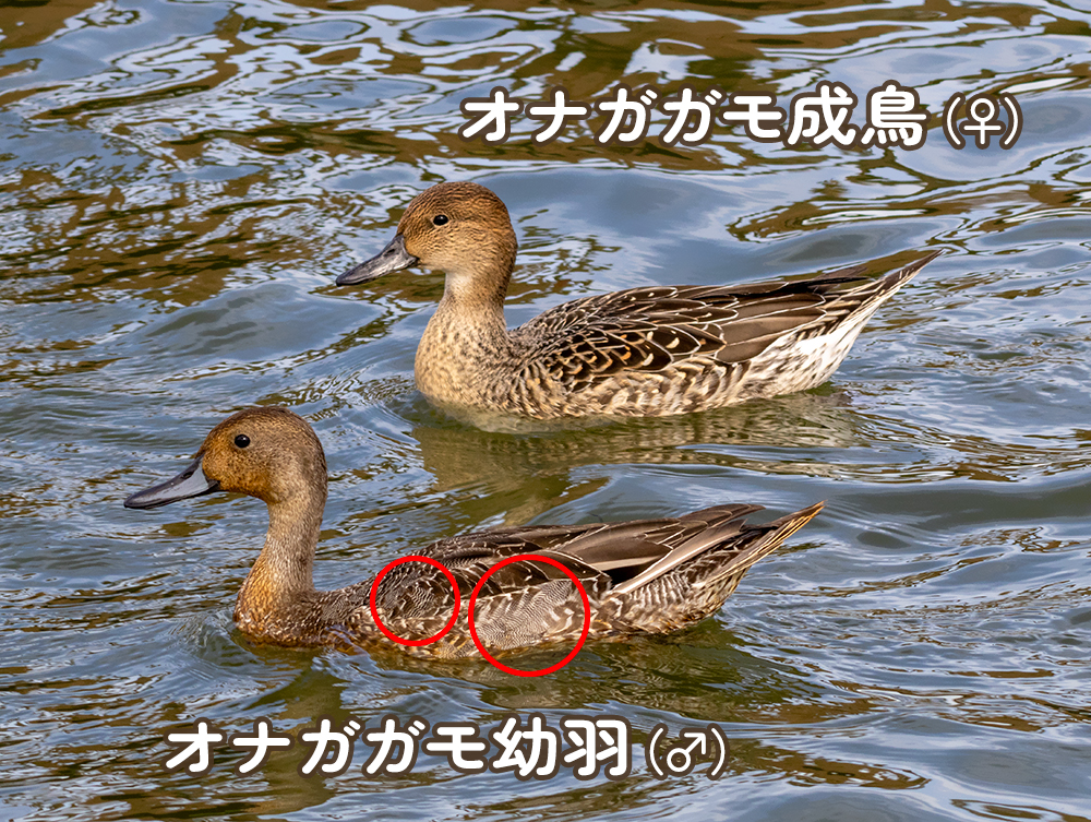 下の写真は、手前の個体が幼羽で、最外三列風切が黒いのと、ところどころに生殖羽が出始めている(赤丸部分)のとで「オス」と分かります。