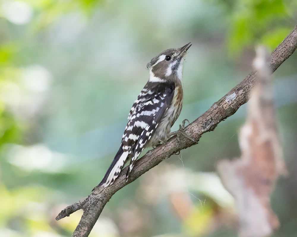 コゲラが木の幹を登っているなぁ、と思って見ていたら、向こうからぴよんと手前の枝に飛び移り、こちらの様子を伺いに出てきました。