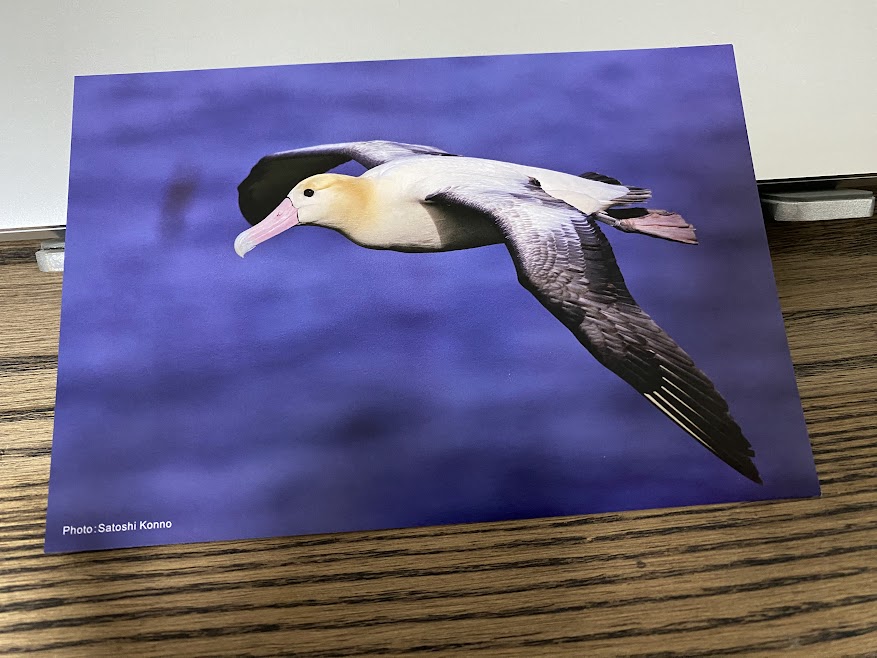 11月下旬にあった愛鳥講演会でトキやヤンバルクイナ、アホウドリの話を聞いて、山階鳥類研究所のアホウドリのポストカードをいただいて帰りました。明治時代に約500万羽が殺されて、山階が禁猟区に指定した発効日までにほとんどが捕られてしまった鳥だそうです。一度絶滅したと思われていましたが、皆さんのご努力で今1万羽近くまで回復しています。いつかこの写真のような、大海原を悠々と飛ぶアホウドリを見てみたい・・と思いました。