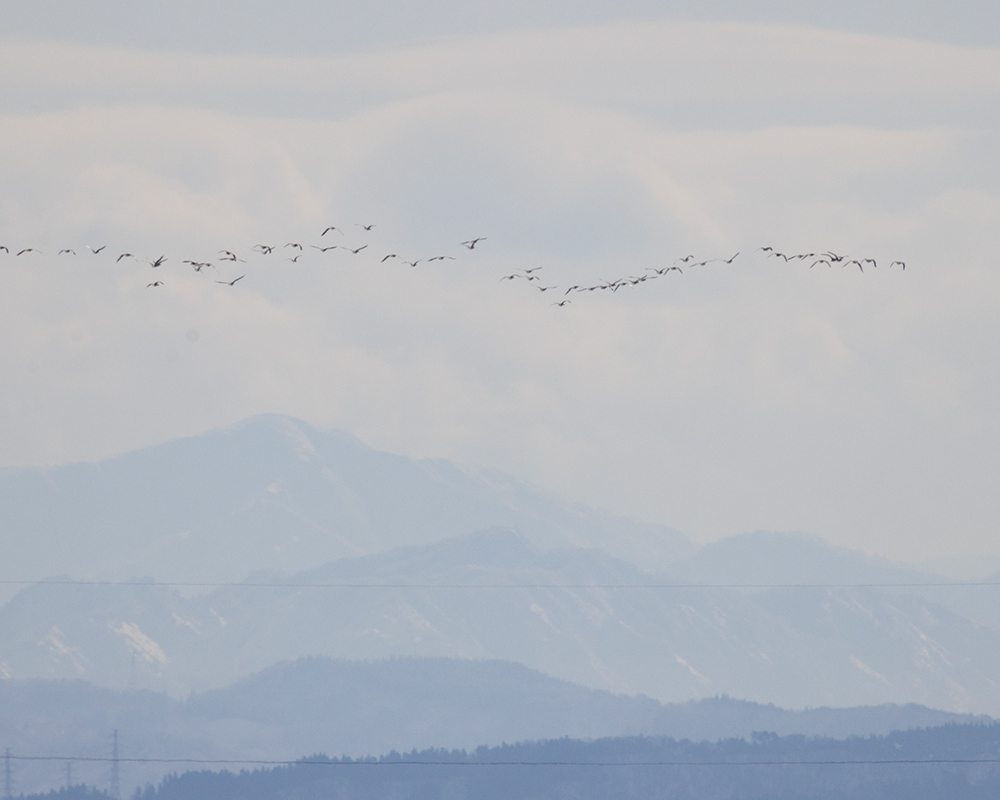 土手で鳥を見ている時に、彼方へと飛んでゆくマガンがいた。山を背景に田んぼを移動するのか。なんとも正月らしい一コマ。
