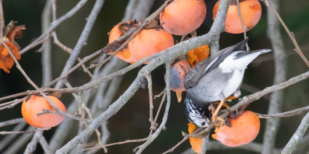 今年はツグミをあちこちで見かけるので、普通にツグミかと思いました!群れで枝に止まって、一生懸命柿の実を食べているムクドリを見て、「食べ物があってよかったね!」。