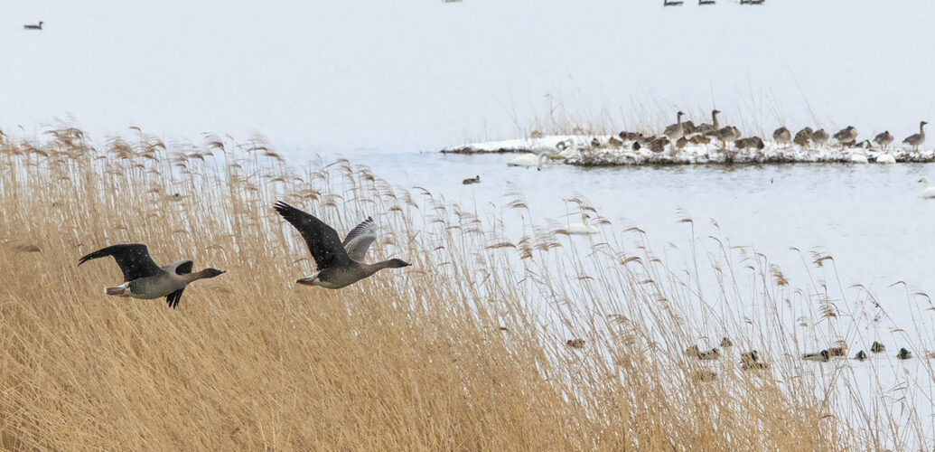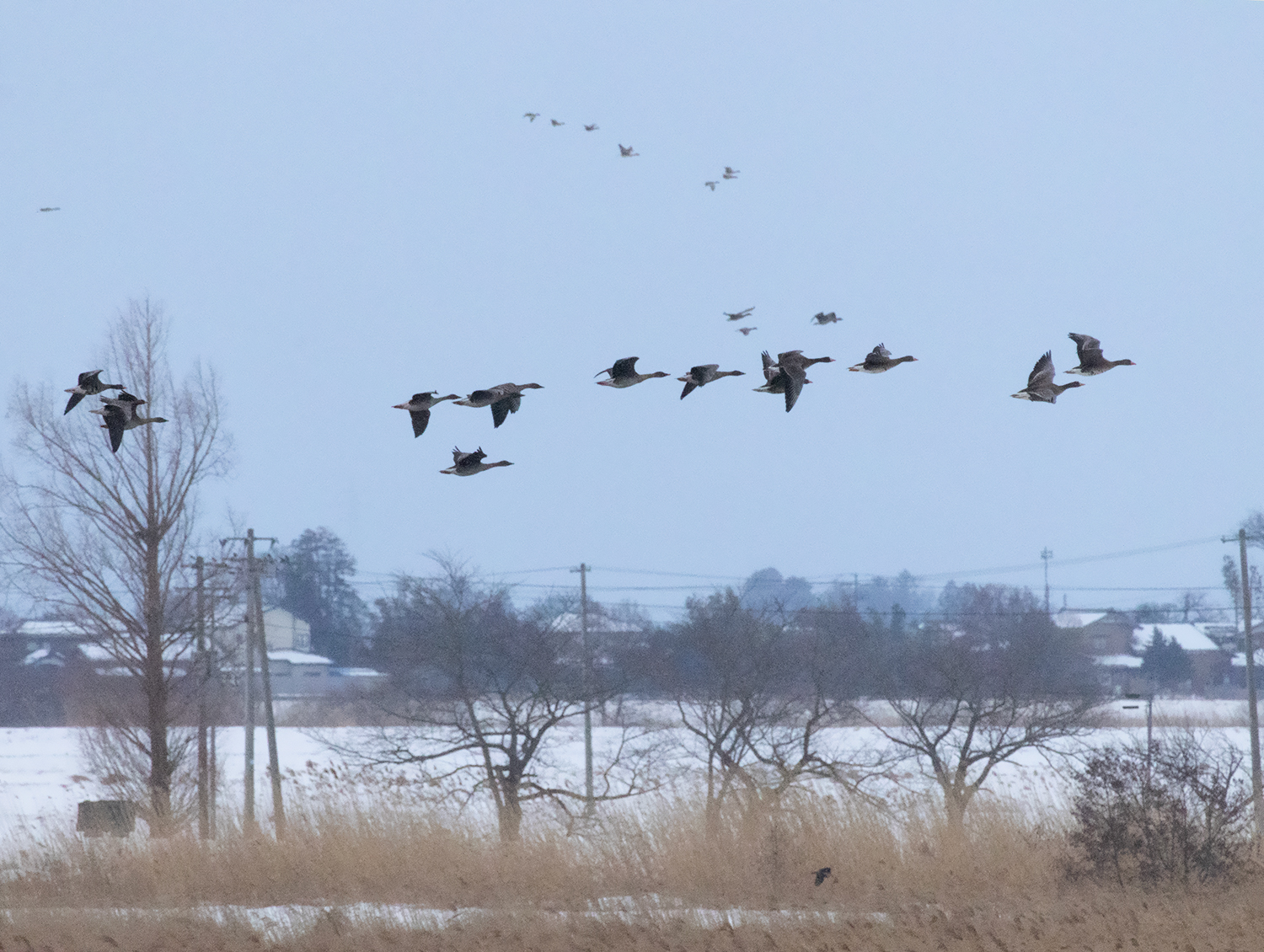朝7時半の潟、多くのマガン・ヒシクイが飛び立った後でしたが、それでも水面にはまだまだたくさん残っていて、休むもの・ぼちぼち飛び立つもの、様々です。
