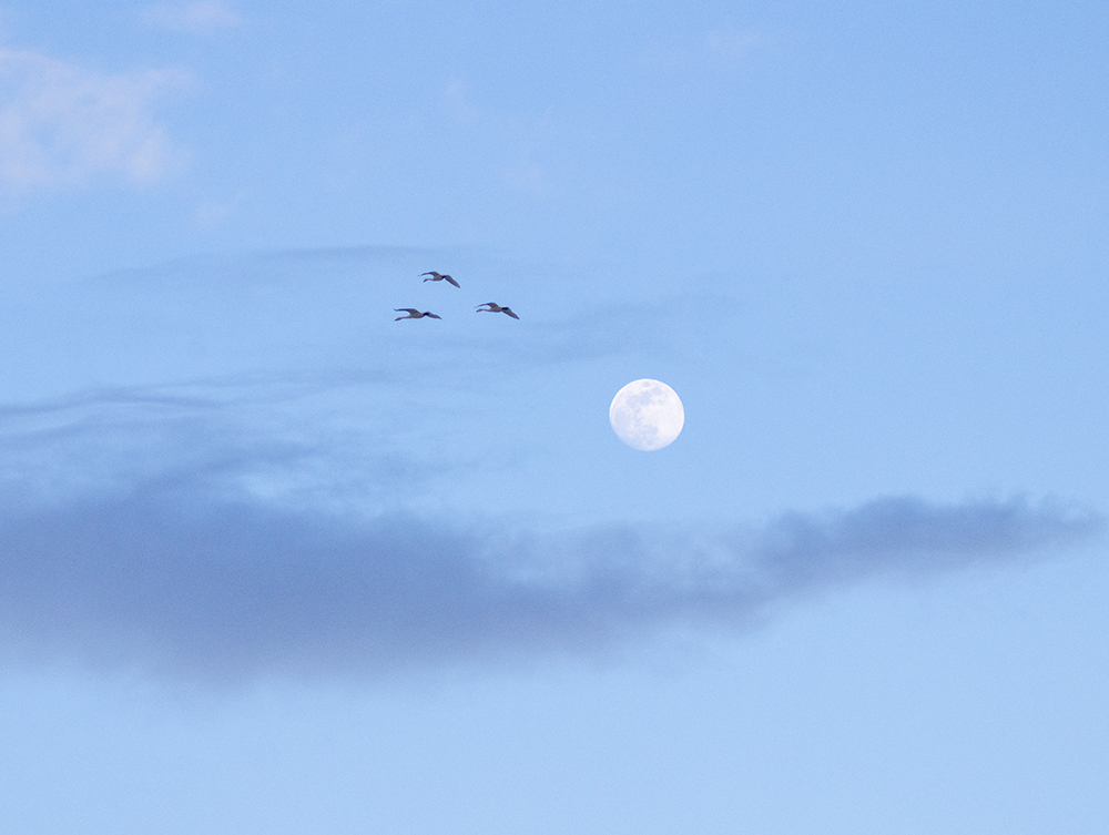 時刻は夕方16時過ぎ、田んぼに出ていたコハクチョウが少しづつ帰ってきました。月がきれい。