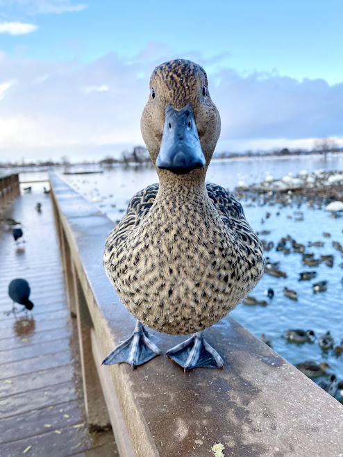 スマホ撮影のオナガガモ子。ごはんないよ。