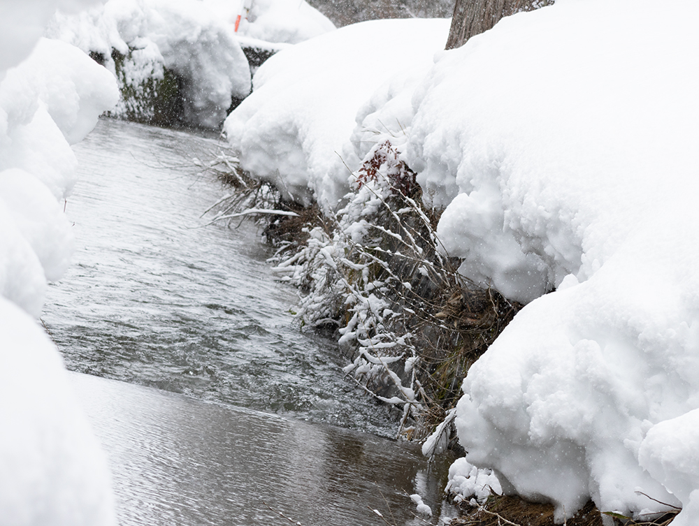 集落の川はこんな感じの、昔ながらの小さな河川。川の両側に、降り積もった雪がせり出してきています。
