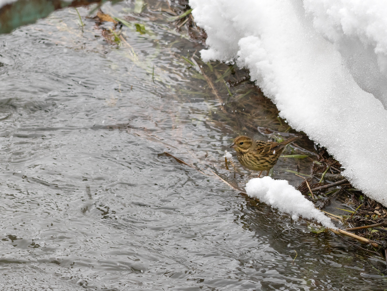 以前も、冬にわずかに残った地面で採餌しているアオジを見たことがあり驚いたのですが、改めてその健気さに胸を打たれました。