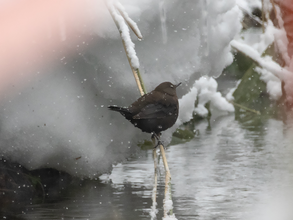 アオジ2羽を見ている時に、ふいに横切る第3の鳥。黒っぽくて、ミソサザイかな?と思っていたら、けっこう大きくて、川の中にじゃぼん!