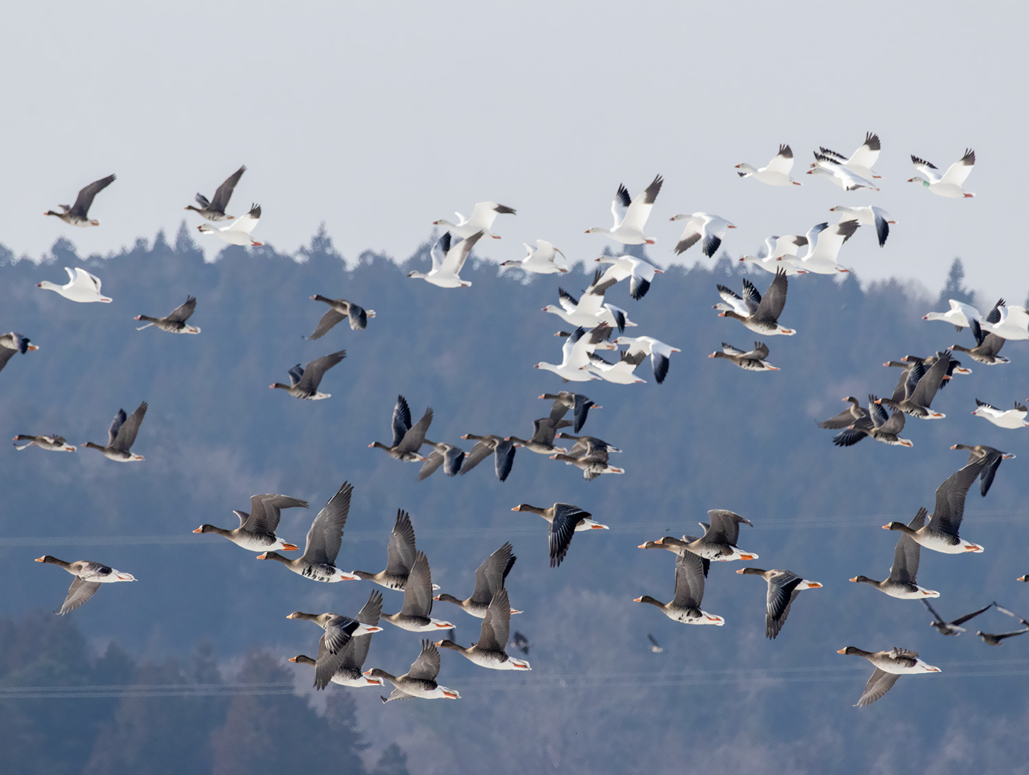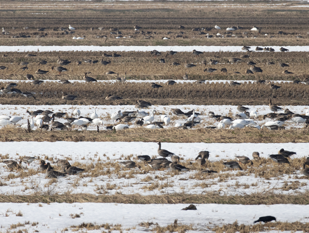 毎年この時期、ガンの群れが立ち寄る田んぼに行ってみたら、もう、ガンだらけでガンの世界という感じ!!春が近づいてきて、ガンたちの北帰行が始まりました。広い田んぼにずらっとマガン・ヒシクイ・ハクガン・コハクチョウが並ぶ。右から左、手前から奥まで、ずらー。
