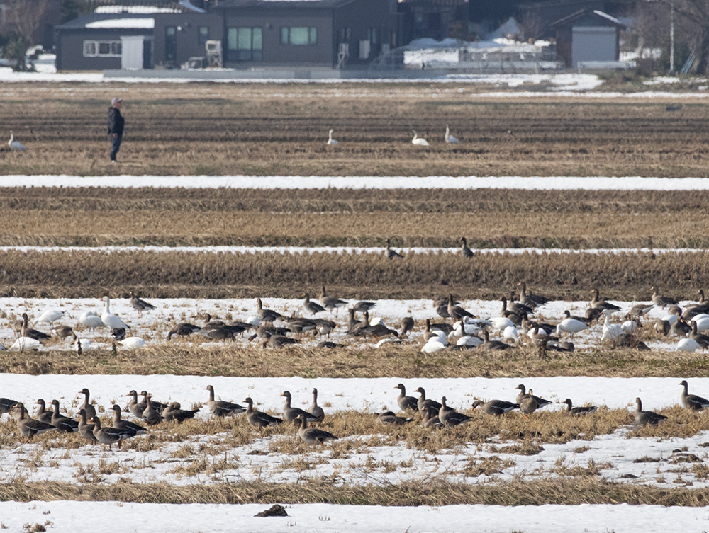 越冬個体数よりも断然数が多く、ざっと数えたら全体で5~6千羽ほど。もっといたかも。きっと上越で越冬していたガンも立ち寄っているのでしょうね。すごい数で、改めて新潟にはコハクチョウだけでなくガンもたくさん飛来しているんだと実感。うれしいです。この数のマガン・ヒシクイを養う事ができる越後平野を誇りに思います。