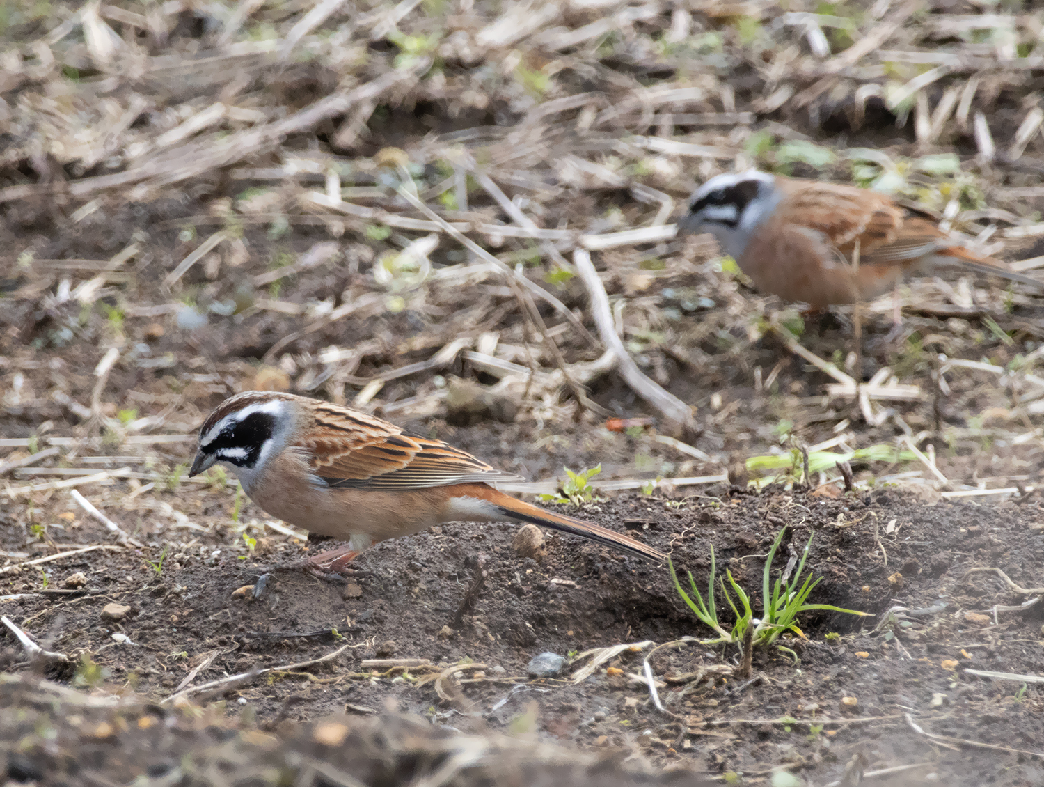 ホオジロのオスが2羽、地面で採餌。まだ冬モード。