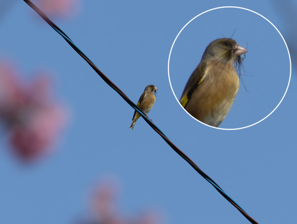 カワラヒワは「ビーン」と鳴きながら、巣材をくわえていた!