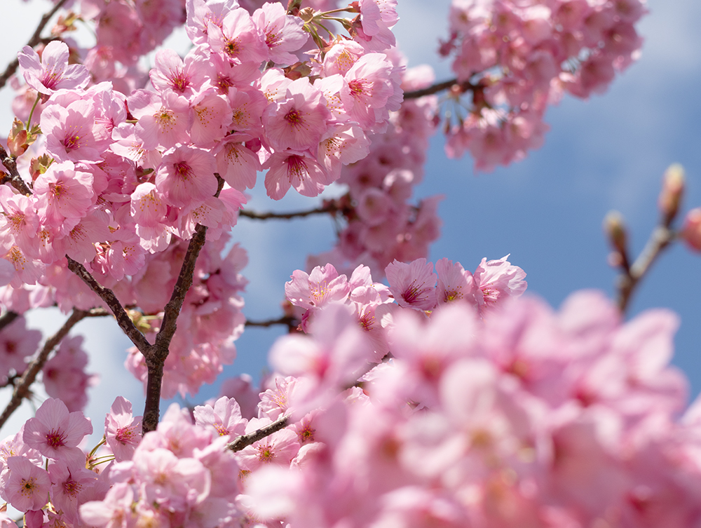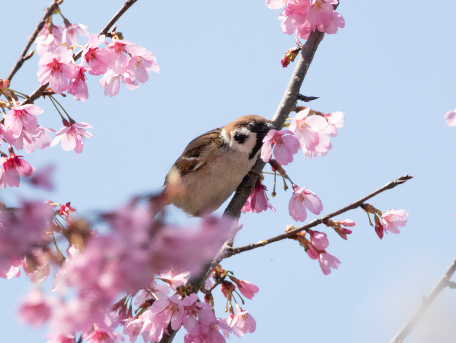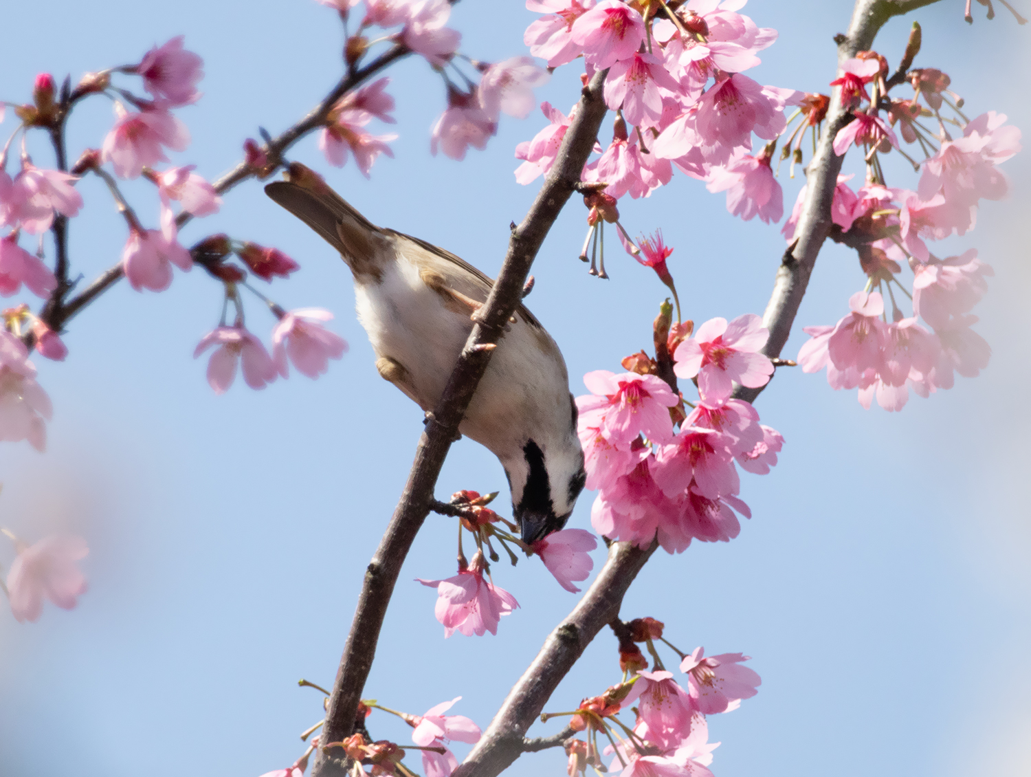 スズメは桜の枝先に止まり、きれいに咲いた花の蜜を食べています。その食べ方は・・・花の付け根をがぶり!!